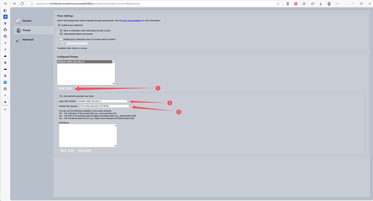 zotero不认识这个网站,因此需要把代理的源网站告诉他在哪就可以了。其他学校的网站还需要同学们自行摸索。