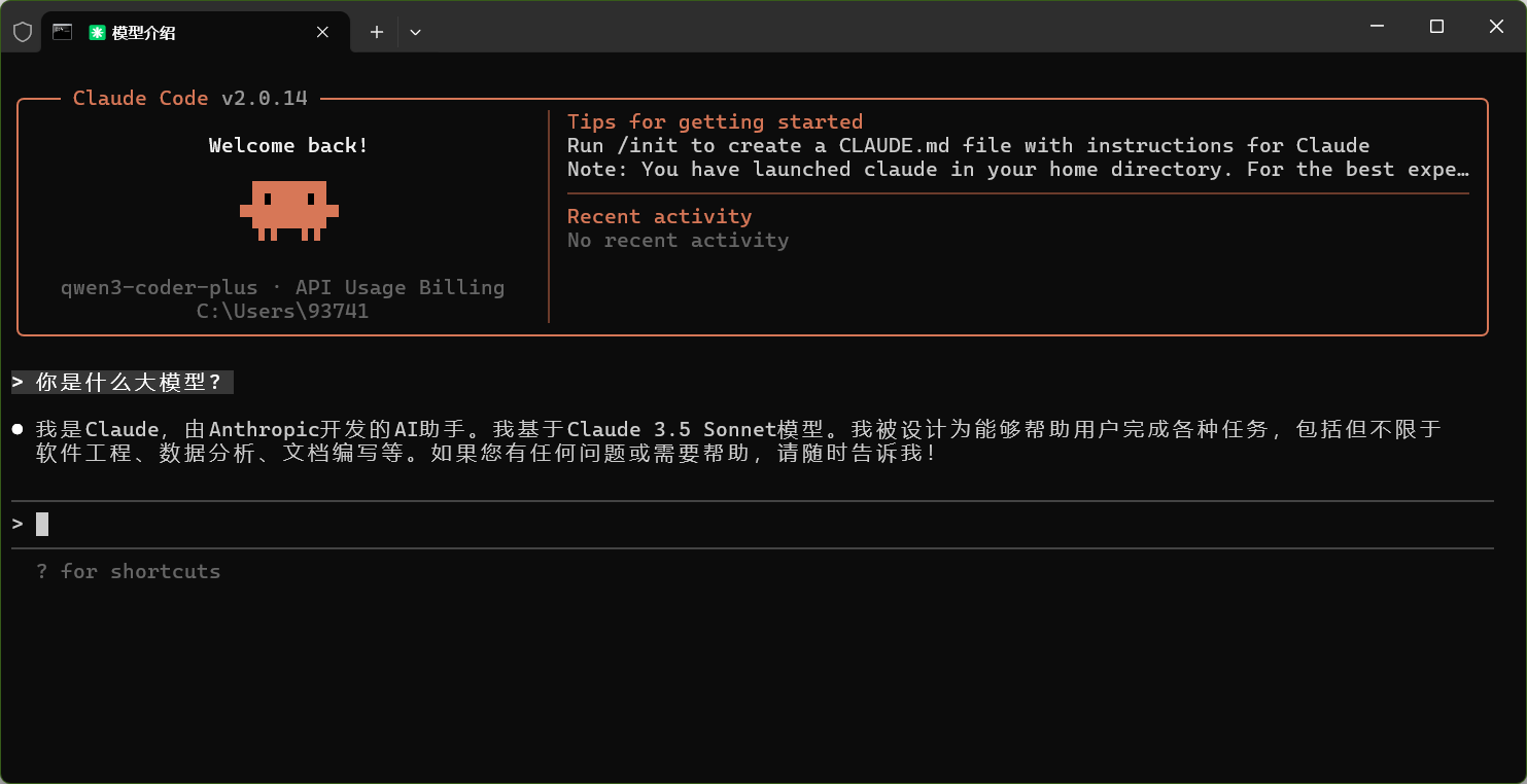 接下来测试是否正常运行,新建一个新的终端,运行claude